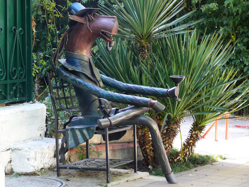 Автор памятника, посвященного персонажу из поговорки, скульптор из Сочи Акоп Халафян. Скульптура представляет из себя металлического коня, одетого в пальто, он развалился на стуле, положив ногу на ногу.