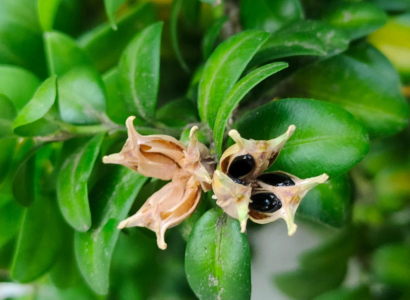 Обычно Самшит вечнозелёный созревает во второй половине июля, но в этом году уже к началу июля большинство коробочек раскрылось и семена высыпались. По словам специалистов, в этом году следует ожидать и раннее плодоношение самшита колхидского.