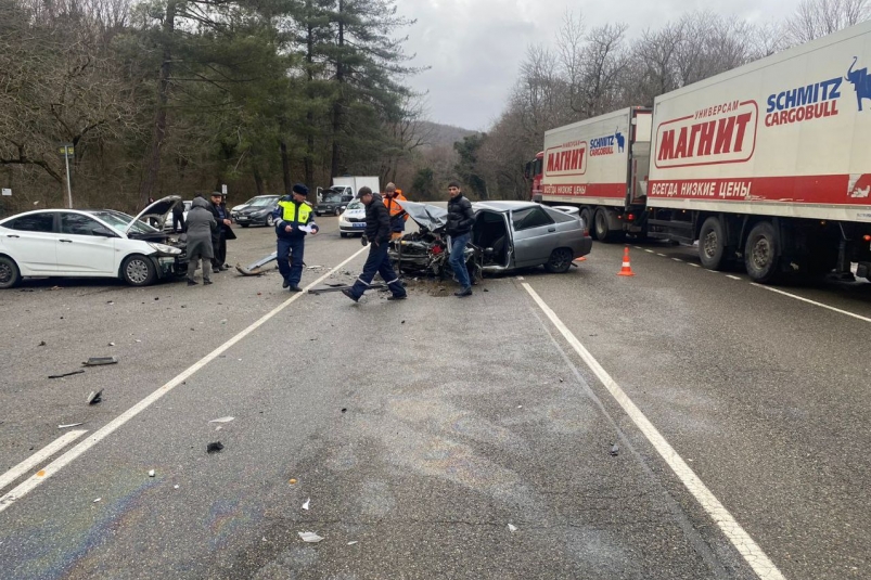 По предварительным данным, 19-лений водитель автомобиля ВАЗ-21124 двигался со стороны Туапсе в сторону поселка Джубга, не выбрал безопасную скорость, в результате чего на закруглении дороги его автомобиль выбросило на встречную полосу движения, где отечественная "легковушка" столкнулась с "Хендай Солярис".