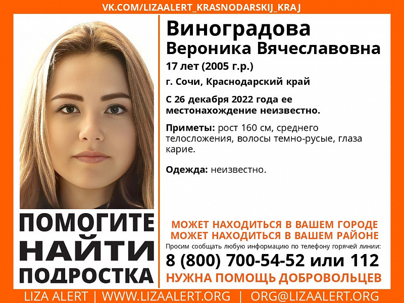 Виноградова Вероника Вячеславовна 2005 г.р. пропала в Сочи 26 декабря, и с тех пор ее местонахождение неизвестно.