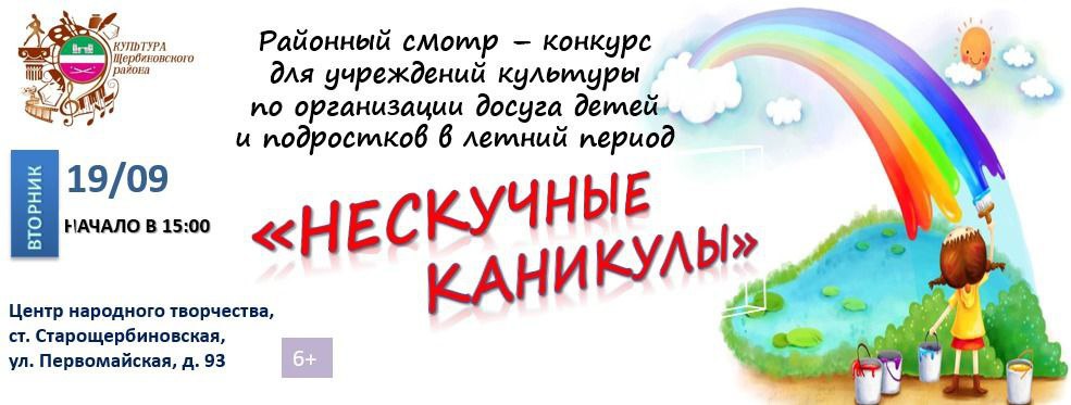 19 сентября в 15.00 в Центре народного творчества станицы Старощербиновской состоится смотр-конкурс "Нескучные каникулы"