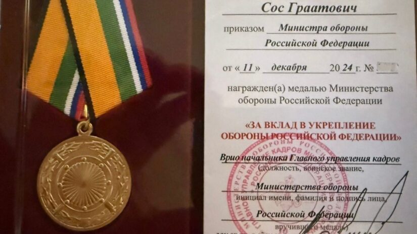 Депутат Городского Собрания Сочи по избирательному округу «Юго-восточный» Сос Мартиросян получил медаль «За вклад в укрепление обороны Российской Федерации». Медаль вручил заместитель министра обороны России, генерал армии Юнус-Бек Евкуров.