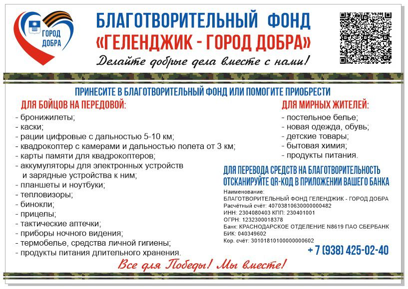 - отправив пожертвования в благотворительный фонд «Геленджик - город добра» через QR-код (открыв и отсканировав код в приложении банка);