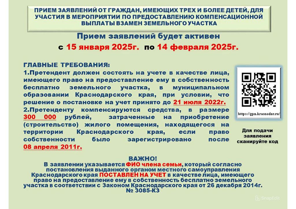 Жители Павловского района имеющие трех и более детей, до 14 февраля 2025 года смогут воспользоваться краевой поддержкой.