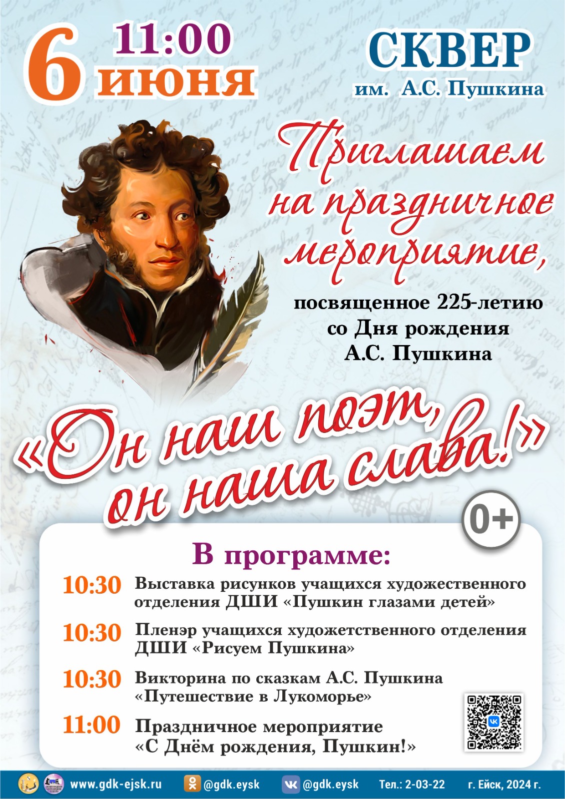 6 июня в 11 часов в сквере им. А.С. Пушкина состоится праздничное мероприятие, посвящённое 225-летию со дня рождения классика «Он наш поэт, он наша слава!»