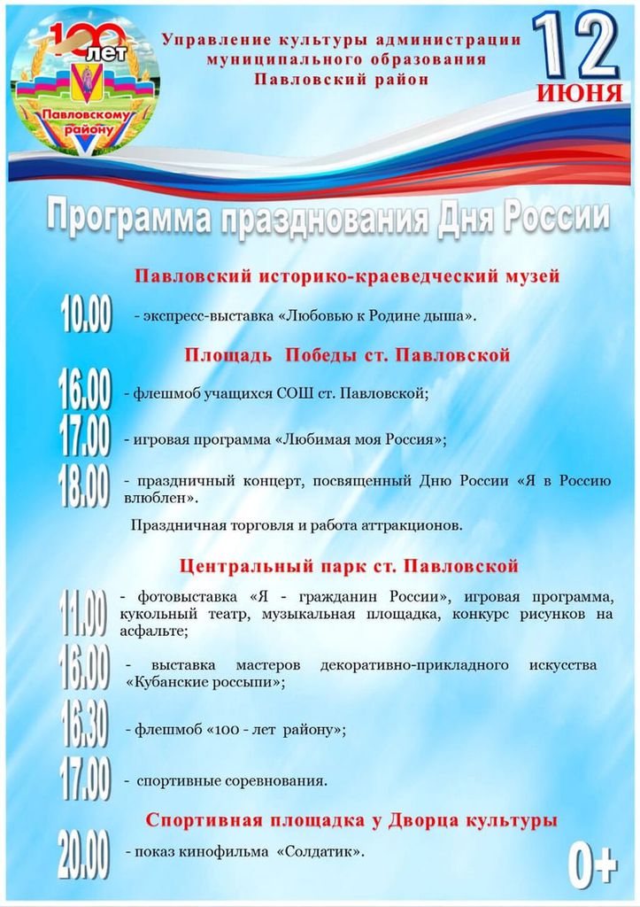 12 июня в 19:00 час. – концертная программа «Здесь Родины моей начало» (СКЦ Новопластуновского СП, ул. Кооперативная, 23).