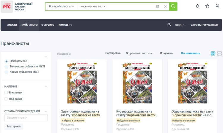 Цены такие же, как и в редакции. Подробности на сайте: https://market.rts-tender.ru/search/buy?s=4&q=%D0%BA%D0%BE%D1%80%D0%B5%D0%BD%D0%BE%D0%B2%D1%81%D0%BA%D0%B8%D0%B5%20%D0%B2%D0%B5%D1%81%D1%82%D0%B8&isHomeReg=false&sort=-PublicationDate