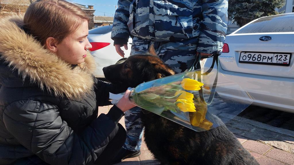 Поздравляли женщин на улицах Ейска сотрудники ППС, а сотрудники кинологической службы вышли на улицы города совместно со своим четвероногим напарником Тоболом. Помимо добрых пожеланий полицейские разъяснили женщинам правила безопасного поведения в общественных местах, а Тобол вручил каждой представительнице прекрасного пола букет весенних цветов.