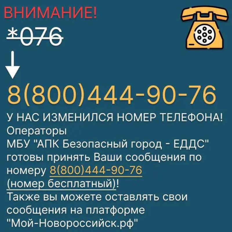 Со следующей недели прекращает свою работу короткий номер *076. Теперь операторы отдела приема обращений в сфере ЖКХ, жизнеобеспечения будут готовы ответить на обращения по бесплатному номеру: 8(800) 444-90-76.