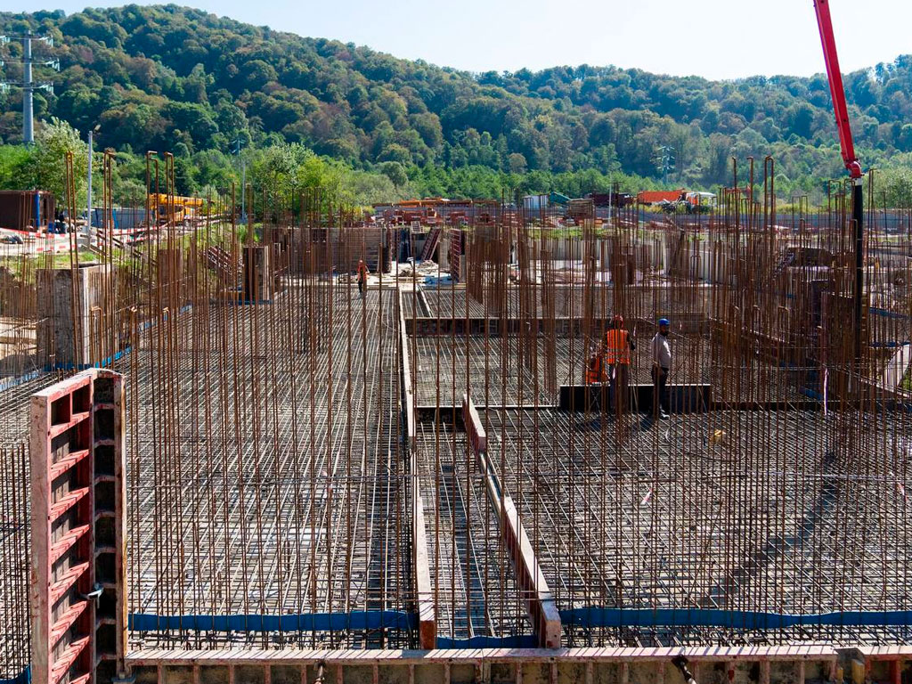 В настоящее время строители бетонируют фундамент и возводят подпорную стену. Все работы иду в плановом режиме.