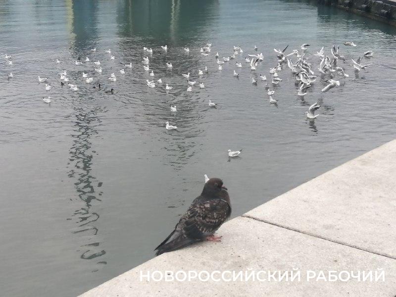 Фото сделано в начале года. Но такая картина - не редкость. Фото автора.Поток бурлящей воды, который врывается из большой трубы всегда отличается от воды в бухте. Он мутный, серо-зеленоватый-грязный, птицы там всегда что-то вылавливают. Большинство новороссийцев уверены, что это неочищенная канализация идет прямиком в море. Отсюда и запахи.