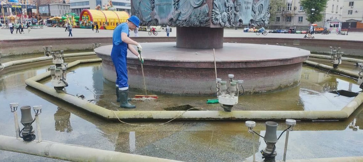 После непогоды в чашах фонтанов нужно было заменить воду, которая стала грязной, убрать занесённый ветром мусор.