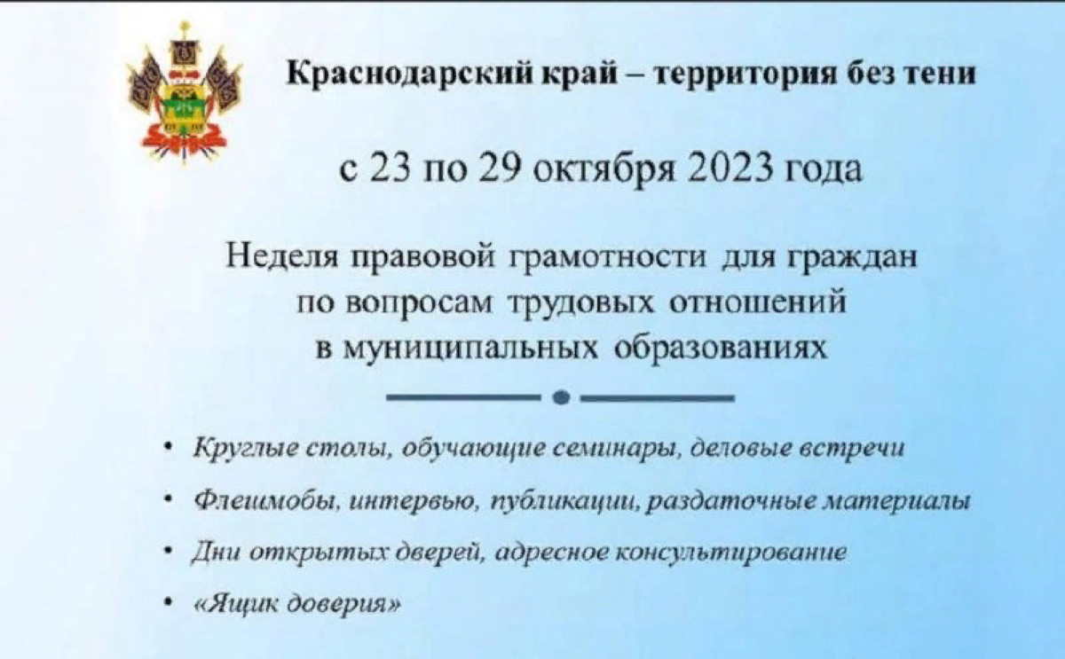 В ТИХОРЕЦКЕ ПРОХОДИТ НЕДЕЛЯ ПРАВОВОЙ ГРАМОТНОСТИ ПО ВОПРОСАМ ТРУДОВЫХ ОТНОШЕНИЙ «КРАСНОДАРСКИЙ КРАЙ – ТЕРРИТОРИЯ БЕЗ ТЕНИ»