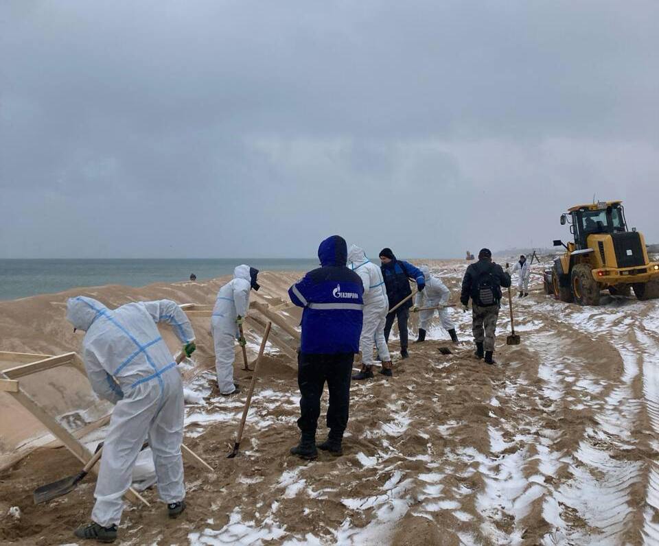 Команды муниципальных образований Краснодарского края, сотрудники МЧС, волонтёры сегодня с утра, несмотря на то, что песок покрыт снегом, усилился ветер и температура воздуха не превышает +2 градусов,