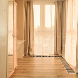 Панорамные окна выходят в благоустроенный двор, заливая квартиру дневным теплым светом.