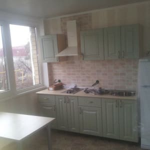 кухня(газовая плита,свч печка,холодильник с морозилкой), утюг с гладильной доской, эл. чайник.,стиральная машина. Стоимость на двоих 9.000 р.в месяц.